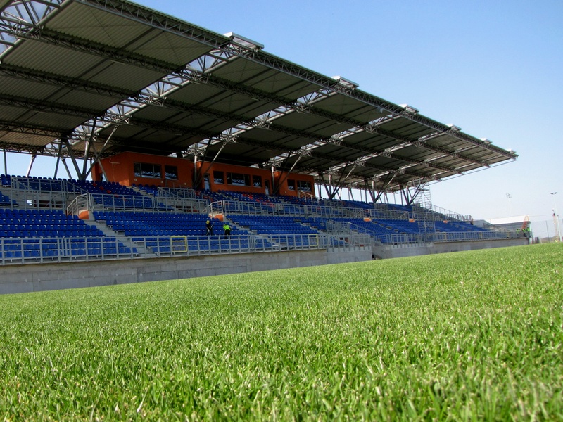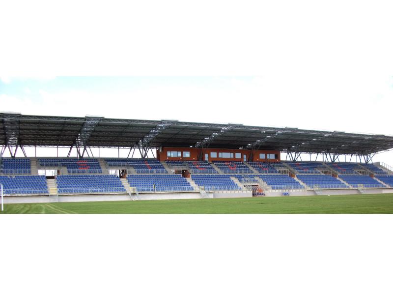 Siedziska stadionowe model WO-07 wraz z metalową konstrukcją wsporczą zamontowane na nowopowstałej trybunie w Mroczeniu...