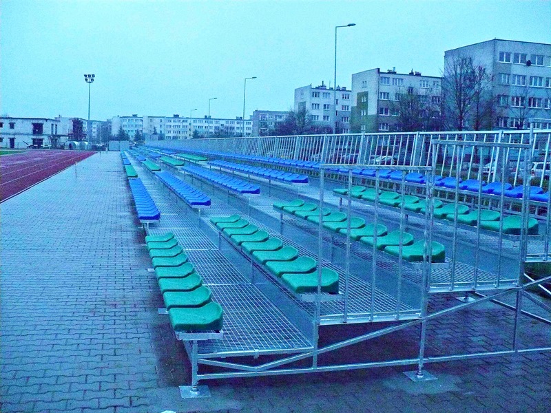 Boisko sportowe w Polkowicach - dostawa i montaż trybuny sportowej 5-rzędowej na 772 miejsca.
